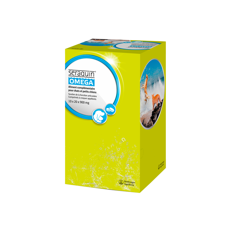 SERAQUIN OMEGA est un aliment complémentaire pour le soutien de la fonction articulaire chez les chats et les petits chiens.