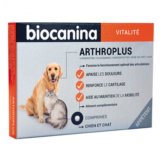 - L’intégrité du cartilage articulaire est un élément indispensable au maintien des capacités locomotrices et au confort de vie des chiens et des chats. Chez les chiens âgés en particulier, les races de grande taille ou les chiens en surpoids, l’arthrose est favorisée et peut alors gêner leurs déplacements et provoquer une douleur parfois invalidante. Par sa composition originale en chondroïtine, glucosamine et MSM, Artroplus apporte l’ensemble des nutriments essentiels au cartilage et au maintien de son intégrité nécessaire pour une bonne locomotion.
