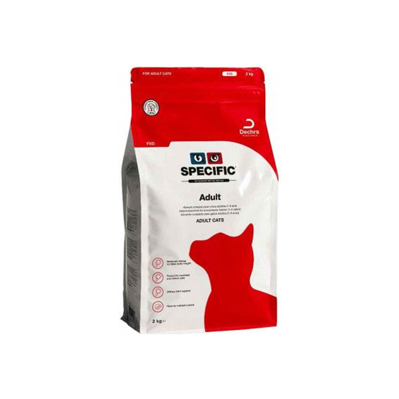 SPECIFIC Adult Cat Food est une recette nutritionnelle complète et équilibrée adaptée spécialement pour les chats adultes. Forte teneur en Oméga-3 issus de poisson ; apport énergétique moyen, destiné à maintenir un poids corporel idéal et des ingrédients pour garder le système urinaire en bonne santé et prévenir la formation de boules de poils.