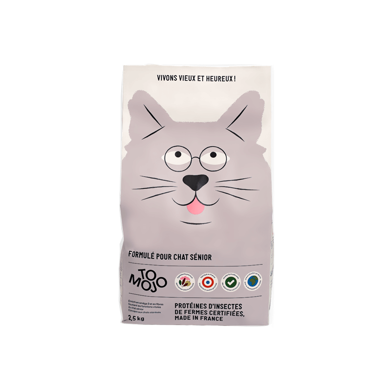 Cette recette pour chat sénior est enrichie en oméga 3 (graines de lin et de chia, huile de tournesol) et enrichie en fibres pour soutenir respectivement le système articulaire et digestif de votre boule de poils.