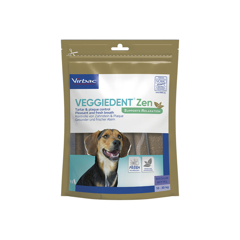 - Les lamelles à mâcher VeggieDent Zen sont pauvres en calories, sans protéine animale, sans gluten, sont très bien acceptées par les chiens et conviennent pour les chiens souffrants d’intolérance alimentaire.