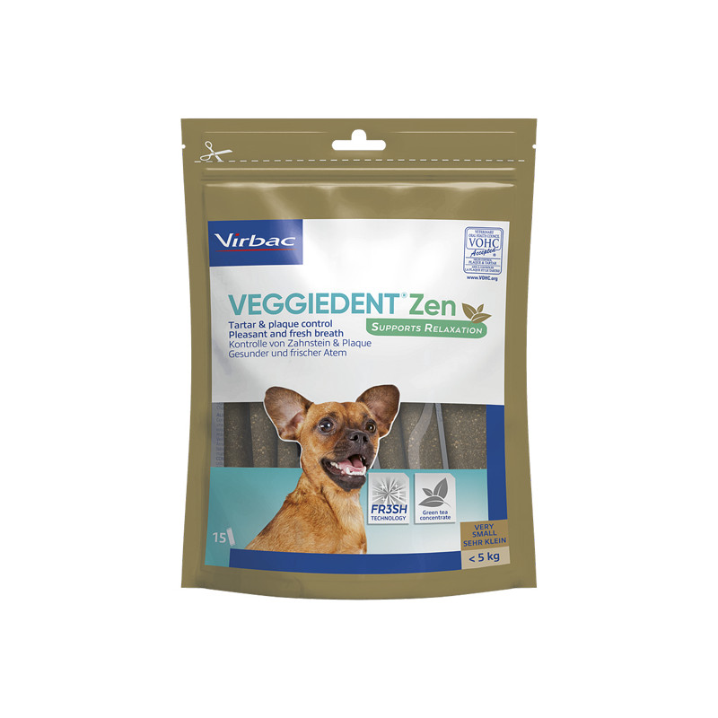 - Les lamelles à mâcher Veggiedent Zen sont pauvres en calories, sans protéine animale, sans gluten, sont très bien acceptées par les chiens et conviennent pour les chiens souffrants d’intolérance alimentaire.