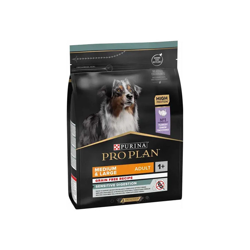 Aliment complet formulé sans céréales pour chiens adultes de moyenne et grande taille ayant une digestion sensible.