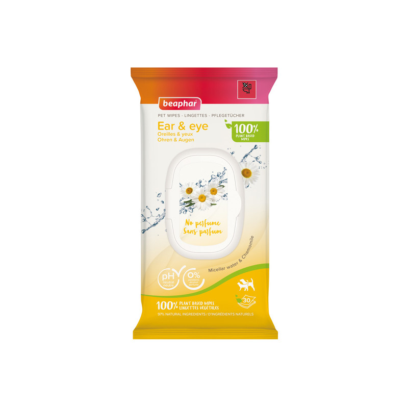 Les lingettes Oreilles & Yeux de Beaphar sont fabriquées à partir de viscose 100% végétale et humidifiées avec une lotion à base d’ingrédients naturels (97% minimum) et sans parfum.