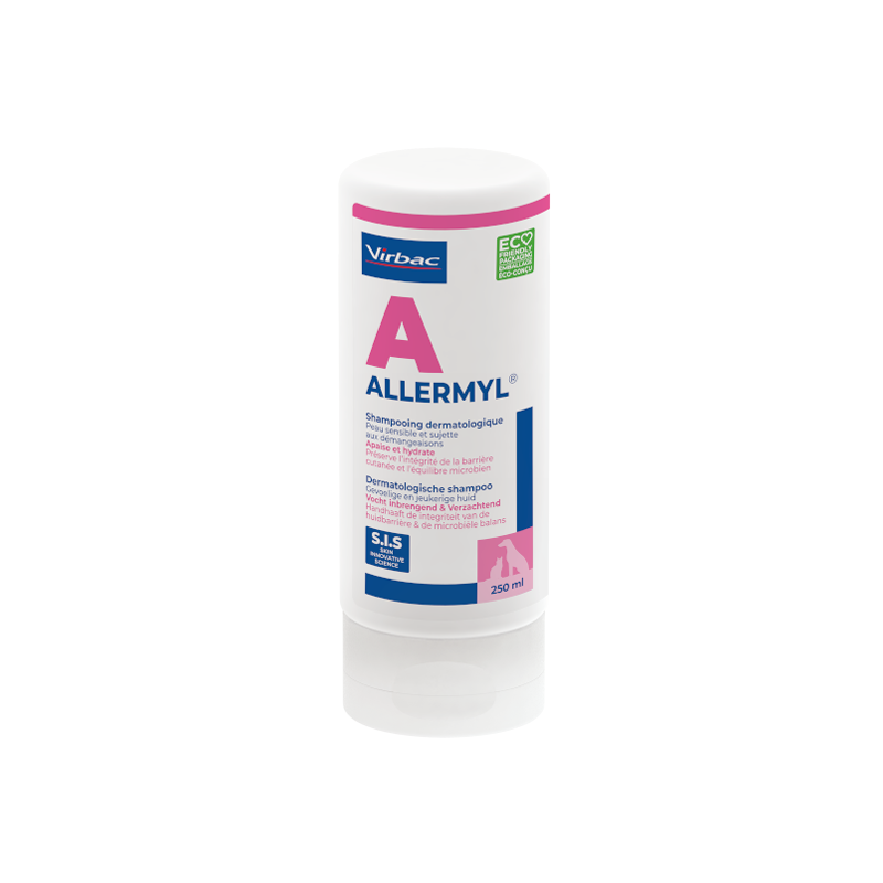 ALLERMYL est un shampooing DERMATOLOGIQUE doux, sans savon, hypoallergénique, conçu pour un usage fréquent afin d’améliorer l'état de la peau et du pelage des chiens et des chats de tout âges, à la peau sensible et irritée.