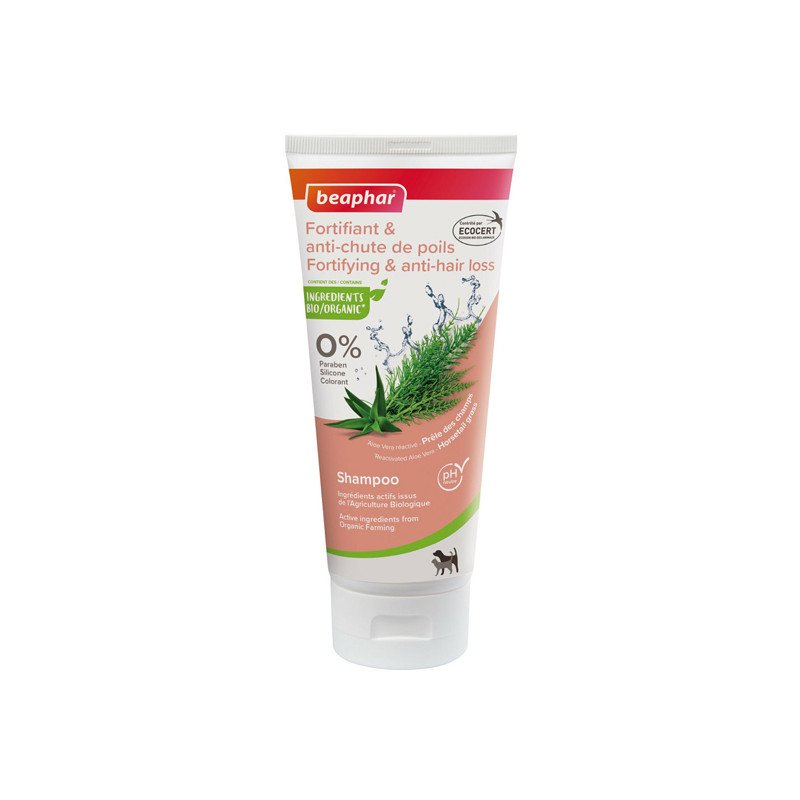Le shampooing Fortifiant & Anti-chute de poils de Beaphar contient de l'Aloe Vera réactivé provenant de l'Agriculture Biologique, ce qui permet d'hydrater la peau et d'assouplir le pelage.