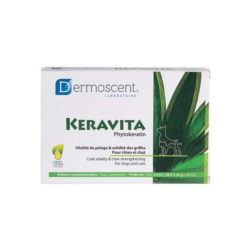 Basé sur une association inédite d’actifs d'origine naturelle : constituants végétaux de la kératine, bambou, vitamines et zinc, Keravita redonne brillance et vitalité au pelage des chiens et chats, contribue à renforcer les griffes et aide à freiner la chute de poils.