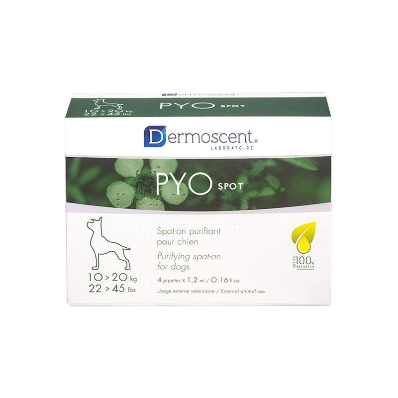 PYOspot est le 1er et unique spot-on spécialement formulé pour aider à purifier et rétablir l’équilibre de la flore cutanée chez les chiens sujets aux déséquilibres récurrents du microbiote cutané.