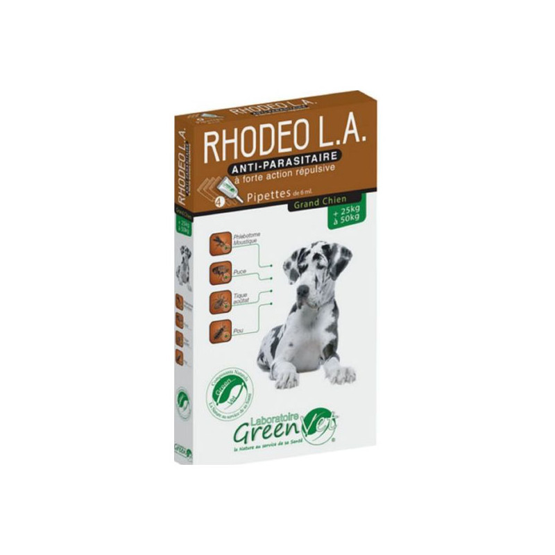RHODEO LONGUE ACTION PIPETTES Grand Chien est un complexe original de différents principes actifs qui lui confèrent une activité répulsive contre les insectes (puces, poux, moustiques) et les acariens (tiques, aoûtats).