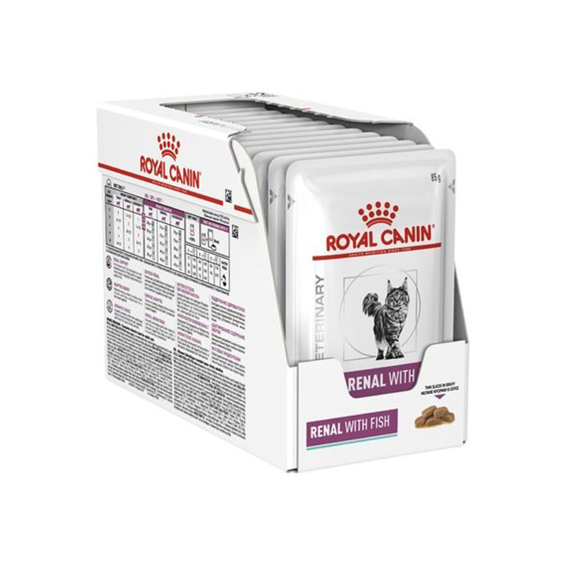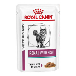ROYAL CANIN RENAL WITH FISH fines tranches en sauce est un aliment diététique complet pour chats formulé pour soutenir la fonction rénale en cas d'insuffisance rénale chronique, grâce à ses niveaux limités de phosphore et à ses protéines de haute qualité.