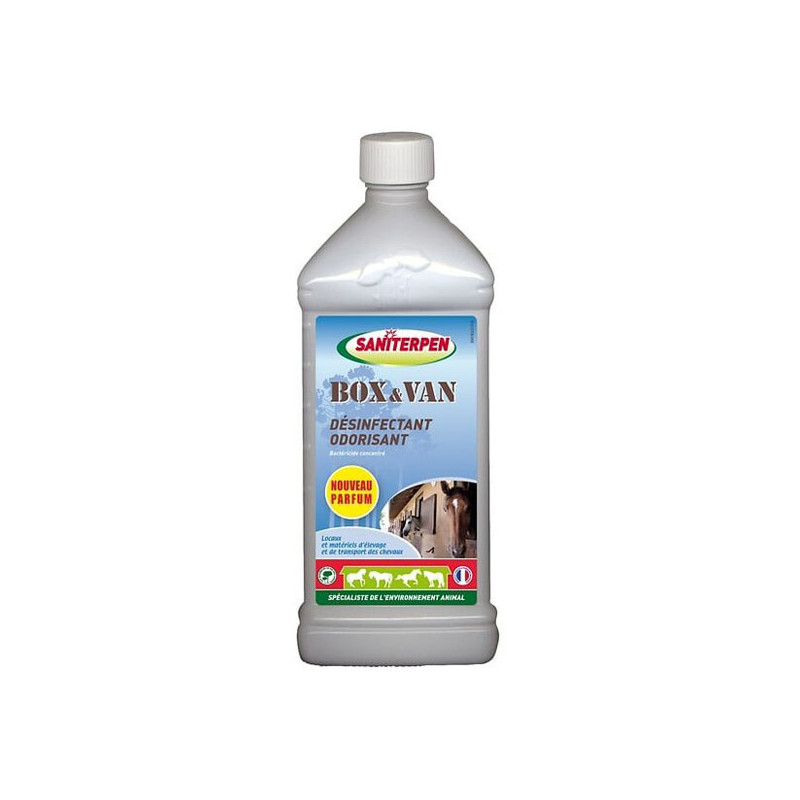 Saniterpen BOX&VAN est un désinfectant concentré homologué pour traiter l'environnement de vos chevaux : écuries, boxes, parties communes, vans, ...