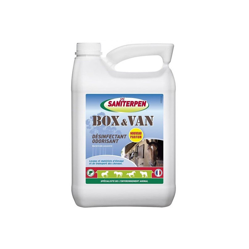 Saniterpen BOX&VAN est un désinfectant concentré homologué pour traiter l'environnement de vos chevaux : écuries, boxes, parties communes, vans, ...