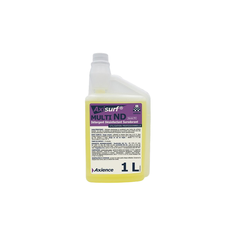 Détergent désinfectant et surodorant pour toutes les surfaces lavables : les sols, les matériaux, les équipements et le mobilier sans contact avec des denrées alimentaires. Activité bactéricide et fongicide. Parfum pamplemousse.