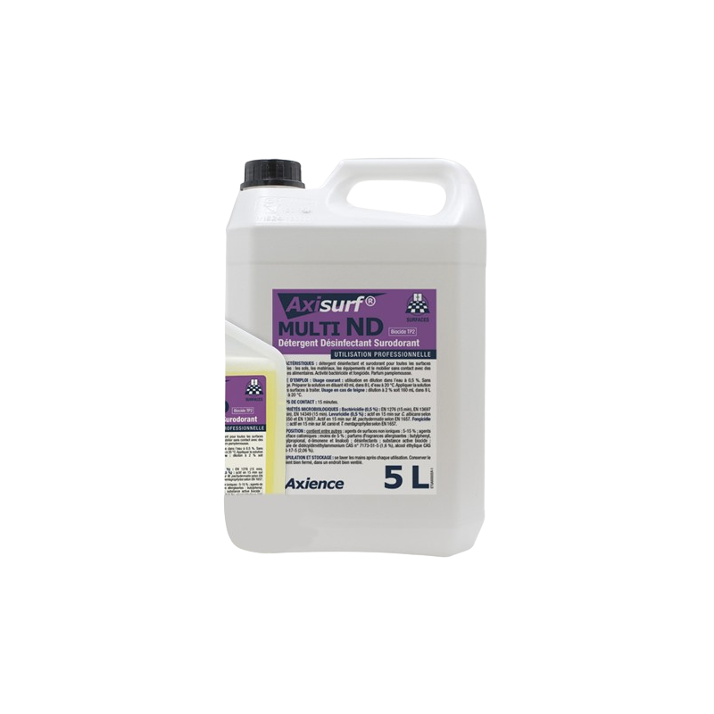 Détergent désinfectant et surodorant pour toutes les surfaces lavables : les sols, les matériaux, les équipements et le mobilier sans contact avec des denrées alimentaires. Activité bactéricide et fongicide. Parfum pamplemousse.