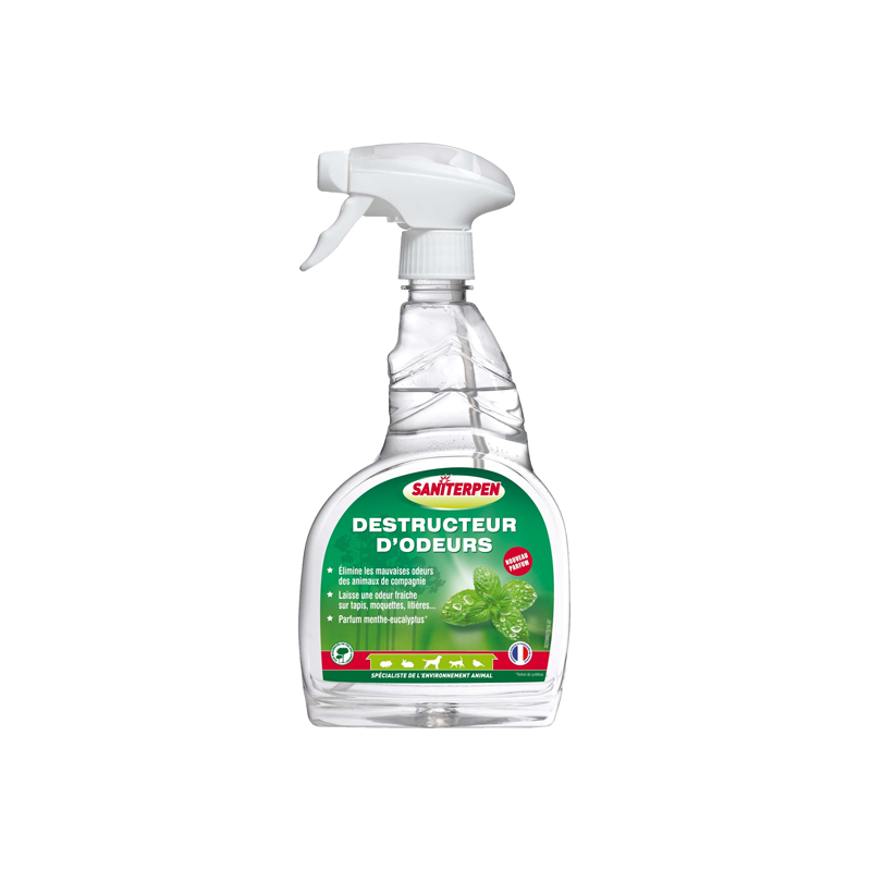 SANITERPEN Destructeur d'odeurs éradique biologiquement les mauvaises odeurs des animaux de compagnie (urine, déjections, pelage humide...) tout en laissant une odeur fraîche, agréable et durable de Menthe-Eucalyptus bien acceptée par les animaux.