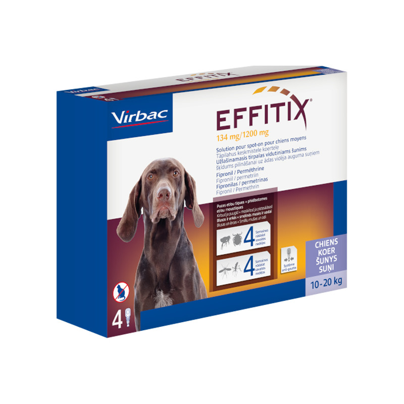 EFFITIX spot on solution for Dogs contient les principes actifs Fipronil et Perméthrine qui contrôlent les infestations de tiques, puces, moustiques et phlébotomes.